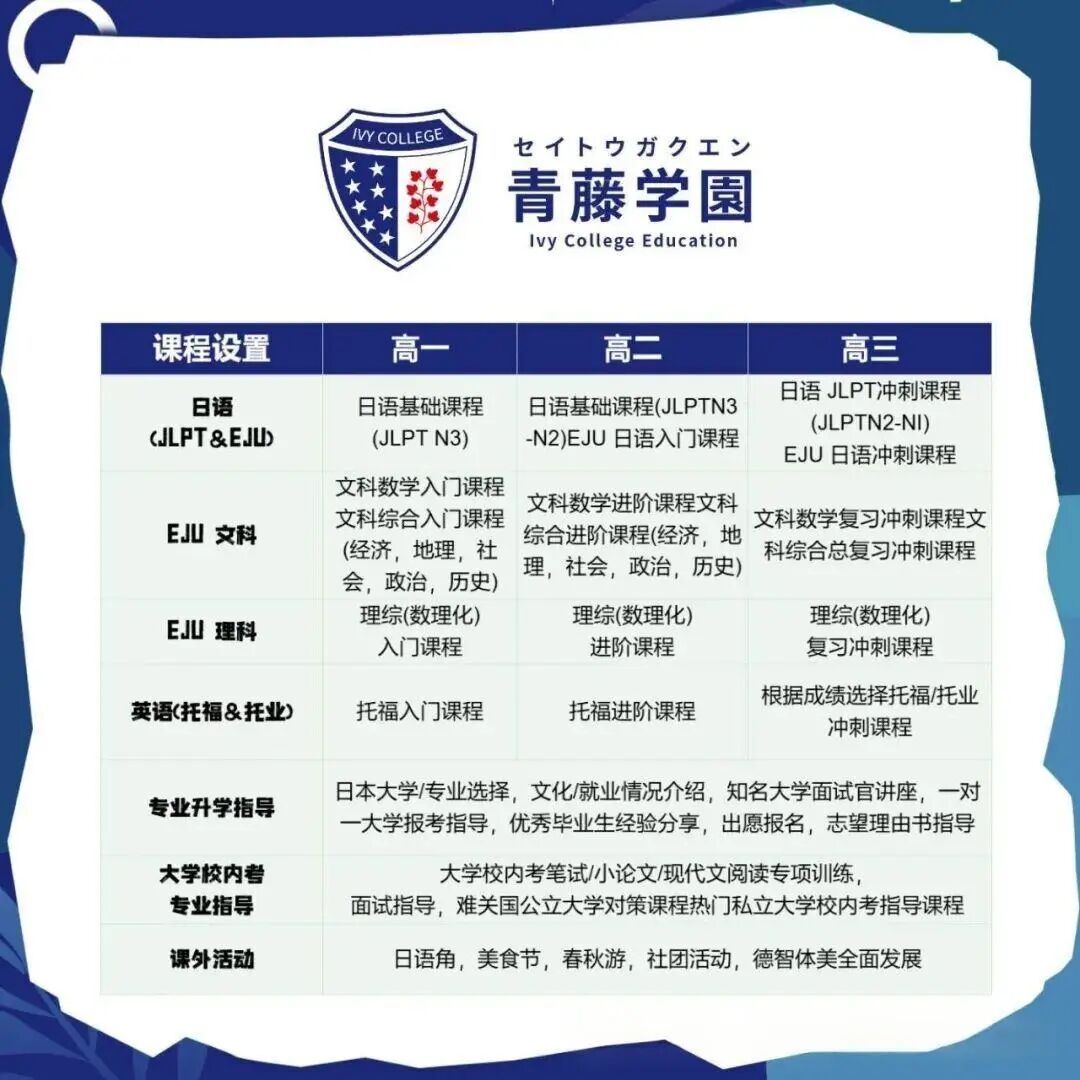 王牌课程:EJU文综课程,目标日本顶尖经营学(会计学、经济学】专业,东京校区【青藤塾】姐妹校双校区共享教研师资资源,为文科学生创造一片新的“进学+就业”未来。青藤学园【东大-京都-国公医班】(仅收20人)——参照日本东京大学录取第五名合作学校日本西大和高等学校“东大-京都-国公医班”课程设置,两校开展学术交流,注重理科,上海+日本优秀师资团队,冲刺日本顶尖公立/私立健康医学、工程学院。