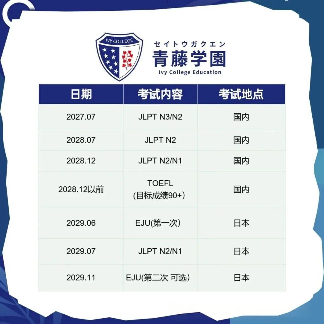 1 参观校园设施,感受学术氛围2. 体验EJU课程,见证名师风采3. 与校领导、教学团队面对面交流4. 聆听东大、京大、早稻田等名校毕业生留学经验分享5. 领取青藤学园精美纪念礼品