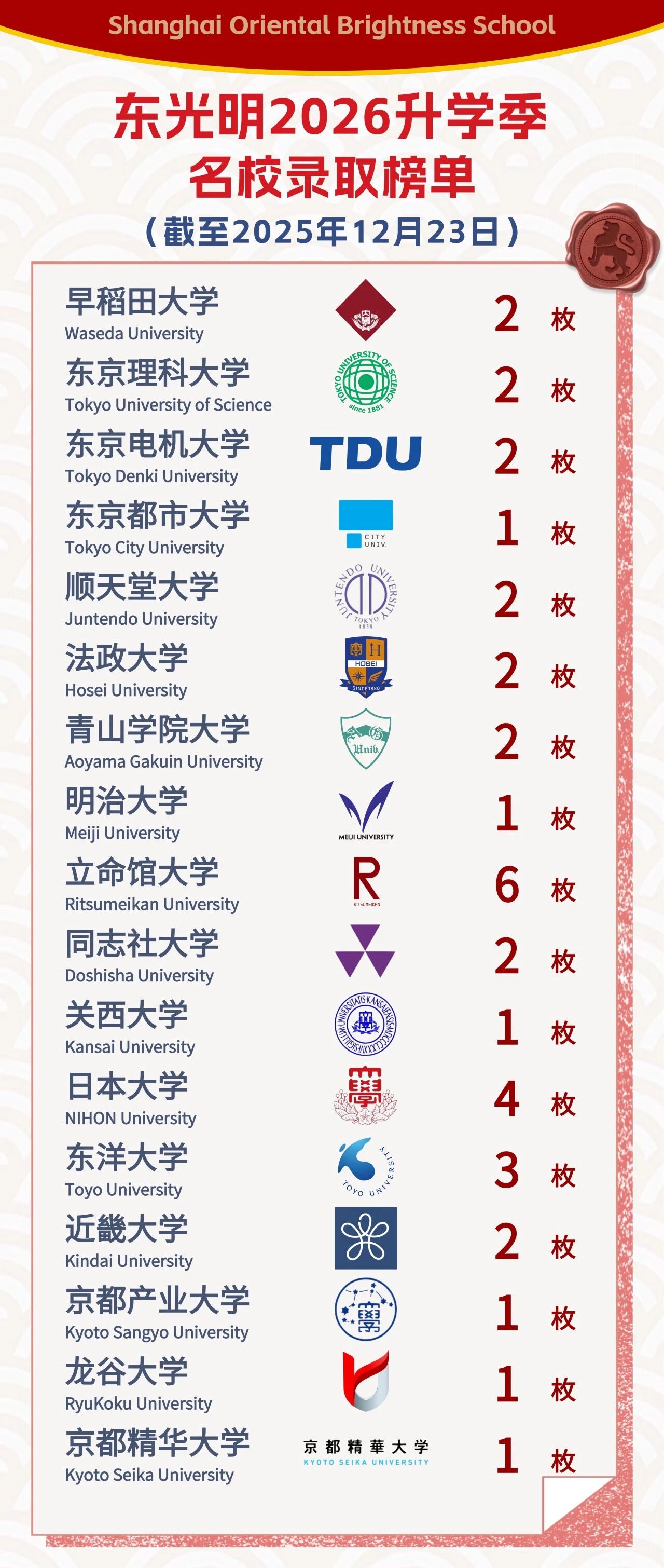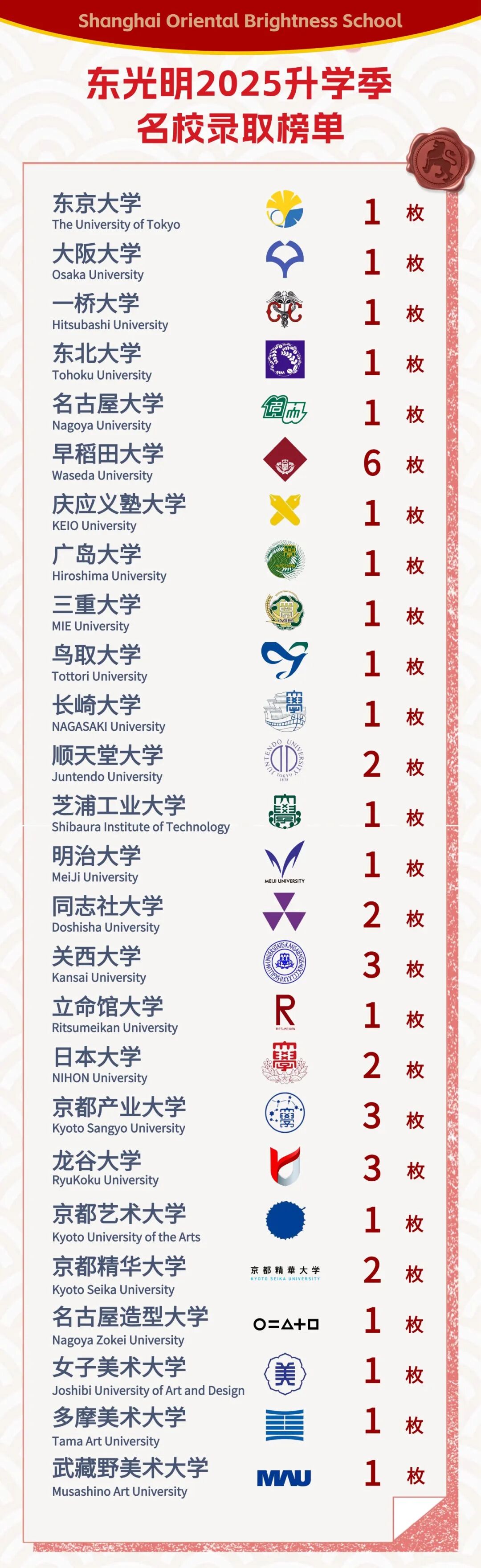 2025升学季,东光明首届37名毕业生硕果累累,共收获了日本名校(类比于中国985、211级别)录取通知书41份。尤为突出的是,本届陈同学成功录取日本最高学术殿堂——东京大学!